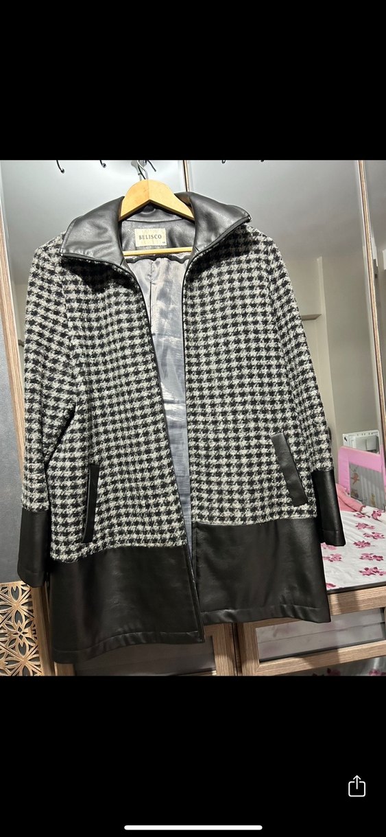 Düğmeli gri midi uzunlukta kadın kaban, deri ve desenli kumaş kombinasyonuyla trendy casual tarz sunar. Notch yaka ve uzun kolludur, günlük kullanım için uygundur.