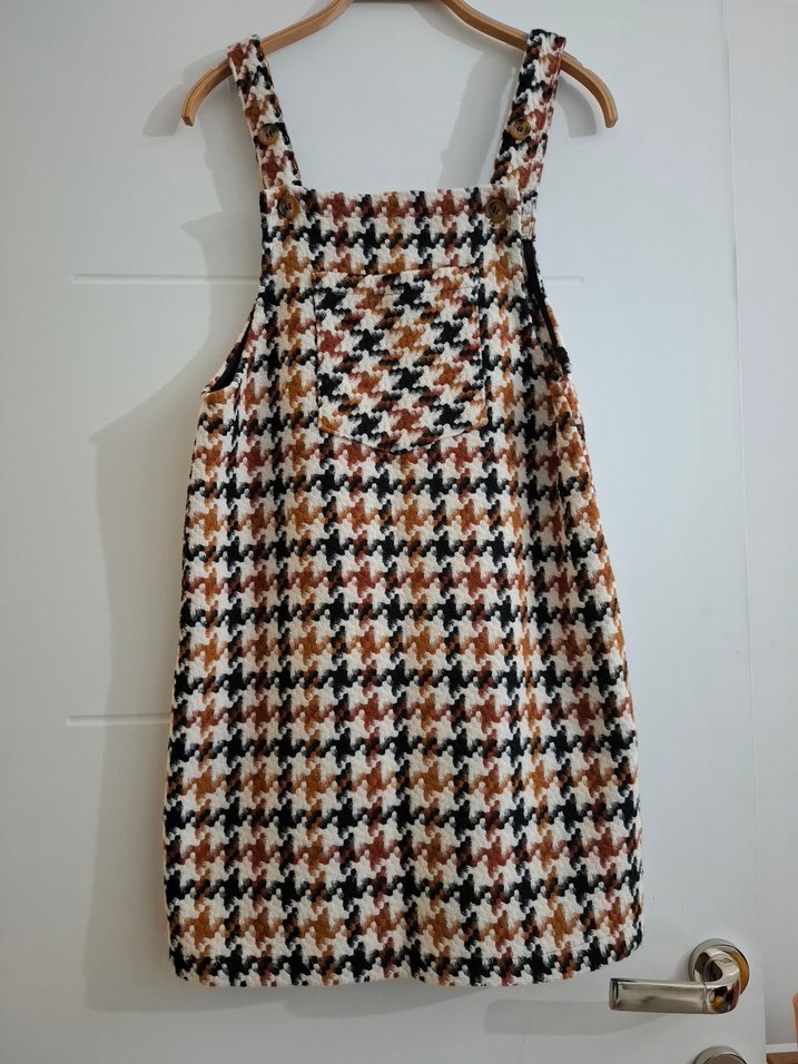 Kahve, krem ve siyah tonlarında kazayağı desenli askılı elbise. Kalın ve tok kumaşlıdır, serin havalar için uygundur. Ön cep detayı ve düğmeli askılarıyla çok tatlı duruyor. Günlük ve şık kombinlere rahatça uyarlanır. Temiz ve iyi durumdadır.