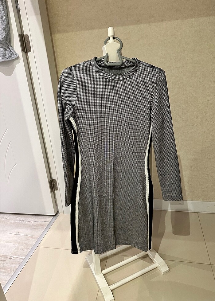 Yanlari siyah beyaz şeritli kaliteli dokuma kumas kaz ayagi desenli elbise