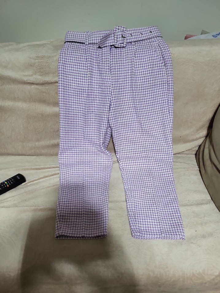 Mor ve gri renkte, kemerli, midi boy, regular fit kadın kumaş pantolon. Yumuşak sentetik kumaştan, günlük ve sokak stiline uygun. 94cm boy bel 42 bir kez giyildi alt paça 18asagi doğru daralan model