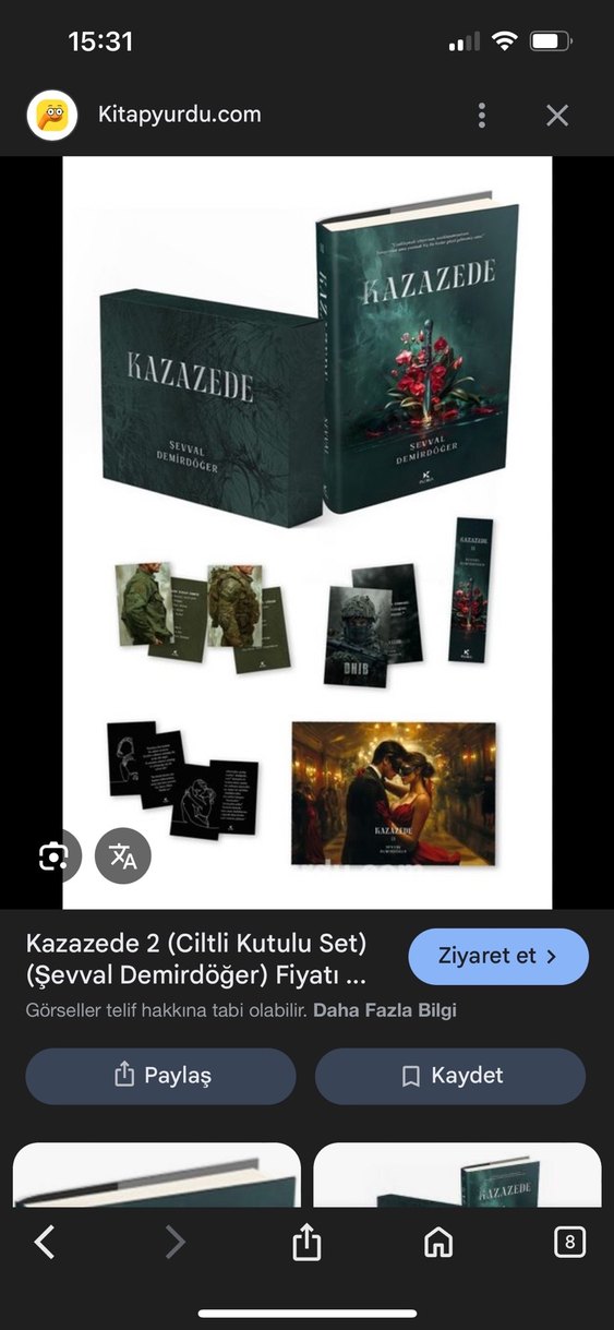 Şevval Demirdöger'in Kazazede adlı iki ciltli kutulu seti, hikayeyi tamamlayan kartlar ve ayraç içerir.