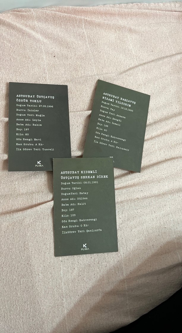 Özgür Toklu, Şizami Yıldız ve Serkan Direk'in biyografik bilgilerini içeren, koyu yeşil renkli karakter kartları