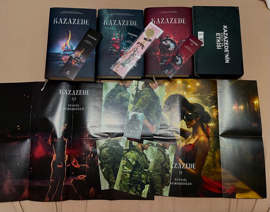 Şevval Demirdöğer'in Kazazede roman serisi, Asker kurgusudur. 1 , 2, 3. kitaptır ciltli, sıfırdır. içinde karakter kartları, ayraç vardır. 1. Kitapta karakter kartları vardır. 2. kitap posterli ve kutuludur. 3. Kitap posterli, karakter kartlı VE KİTABA ÖZEL SINIRLI SAYIDAKİ KOLYE MEVCUTTUR!! .Kitapların hiçbir yerinde zarar yoktur, kırışıklık, buruşma, çizik yırtık yoktur.