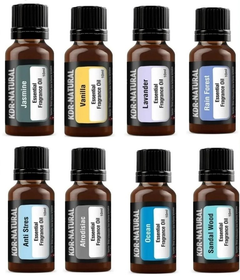 KDR-Natural esansiyel yağ seti; yasemin, vanilya, lavanta, yağmur ormanı, anti stres, afrodizyak, okyanus ve sandal ağacı kokularını 10 ml şişelerde sunar daha fazla koku var dir
