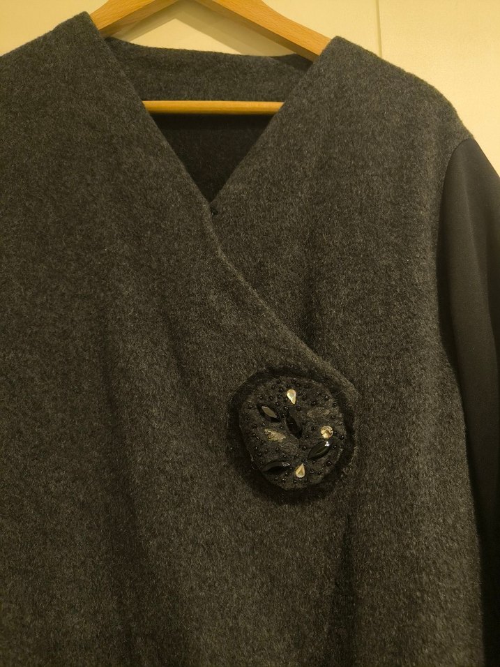 Gri renkte, düğmeli ve yakalı uzun kollu amvelop kaban. Rahat kesimi ve yumuşak, sıcak kumaşıyla günlük kullanıma uygundur.Kolları esnek dalgıç kumaştan.Astarsızdır,yakasından çıtçıtla kapamalı Hamilelerin ve kilolu hanı ların kurtarıcısı olucak bir model.