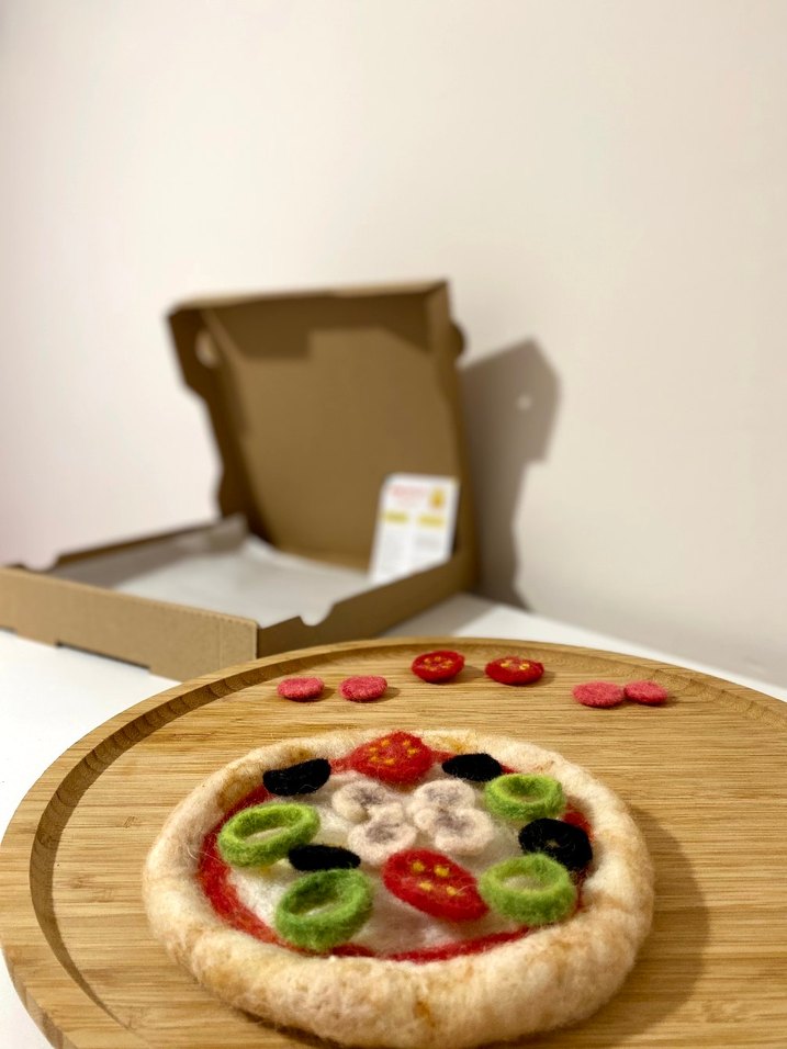 Ürünün keçe iğneleme tekniği ile üretilmiş ve El yapımıdır. İçeriği; Keçeden pizza tabanı, 4 adet yeşil biber, 4 adet domates, 4 adet zeytin, 4 adet sosis, 4 adet mantar, oyun kartı ve özel pizza kutusunda.