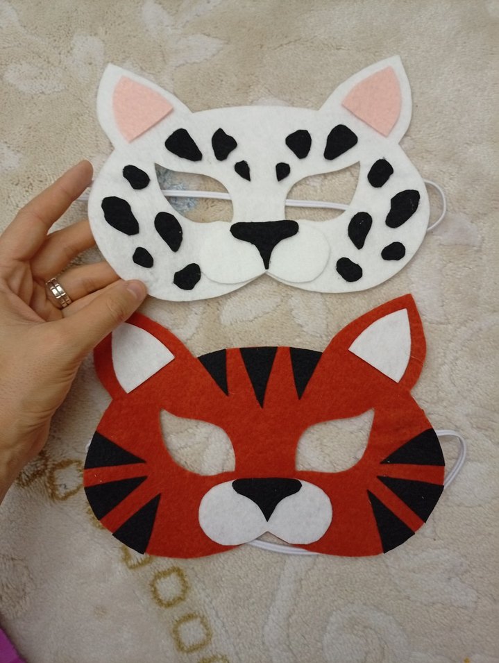 Beyaz ve turuncu renklerde, siyah lekeli ve çizgili, elastik bantlı renkli kedi aslan kaplan çıta temalı maskeler.
