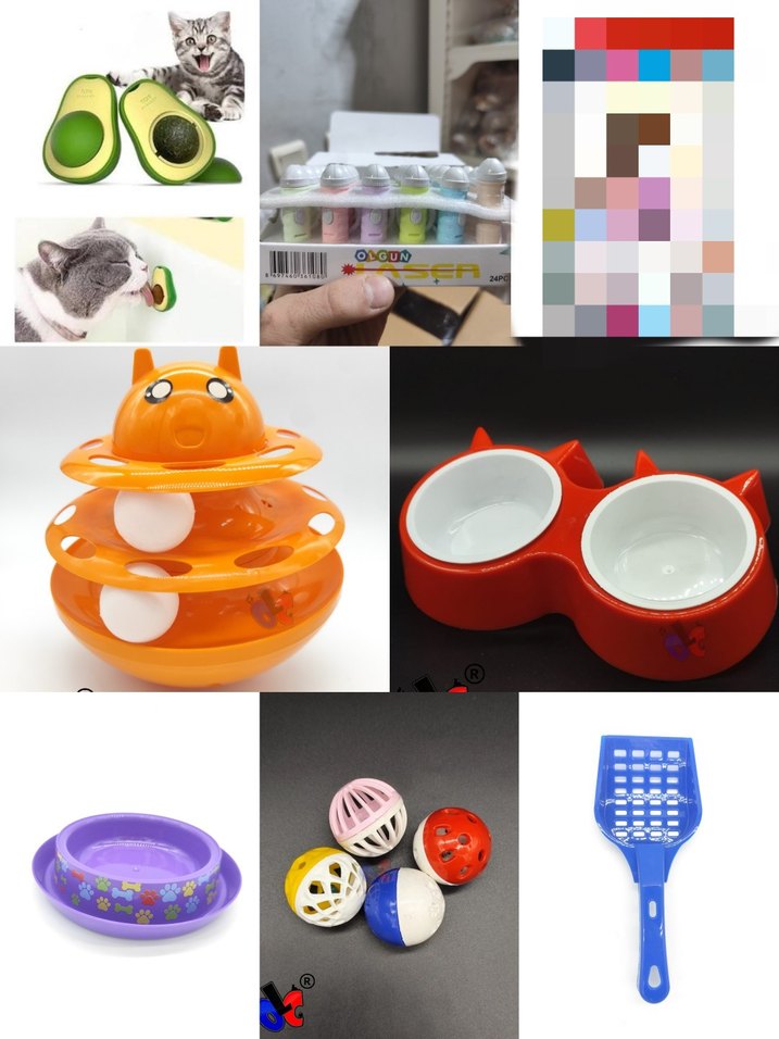 Turuncu renkte, çok katmanlı oyuncak, çift mama kabı, toplar, çöp küreği ve avokado şeklinde oyuncak içeren renkli kedi aksesuarları seti.