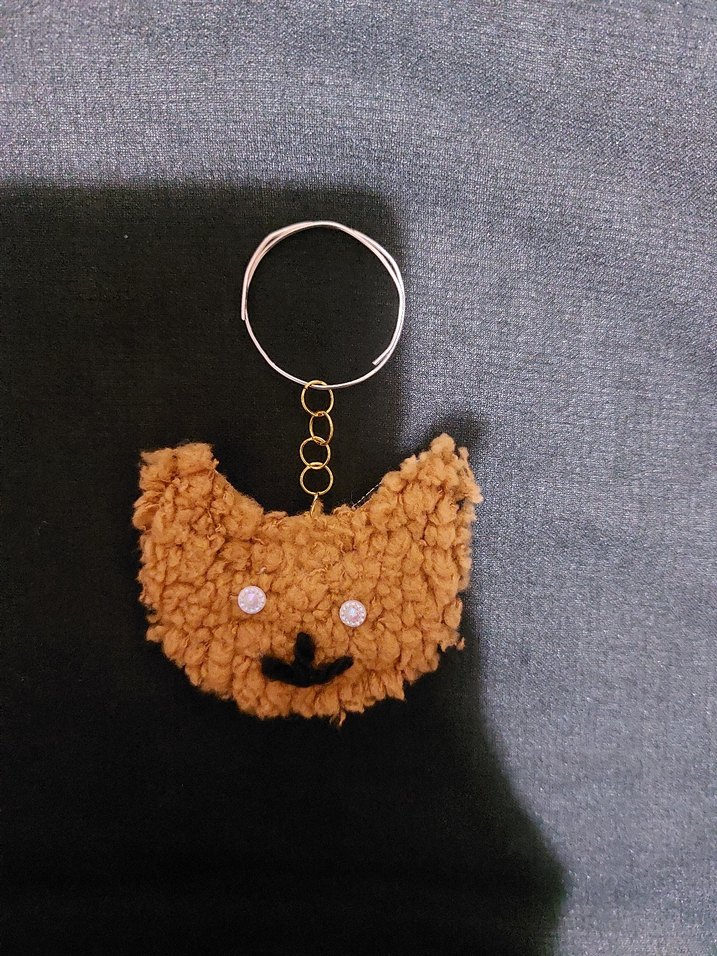 Kahverengi, gülümseyen yüz şeklinde kedi anahtarlık. Metal halka ile rahat ve kullanışlı yeni yapıldı hiç kullanılmamıştır kusuru defosu bulunmuyor.