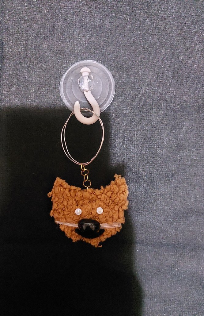 Yumuşak dokulu, kahverengi renkli detaylara sahip kedi yüzü şeklinde anahtarlık ve duvar süsüdür yeni ,el yapımı, askı yapışmıyor bir sorun yok biraz yapışkan yardımıyla ( kaliteli bir yapışkan olması önemli.) dolabınıza süs olarak asabilirsiniz. kusuru defosu yoktur.