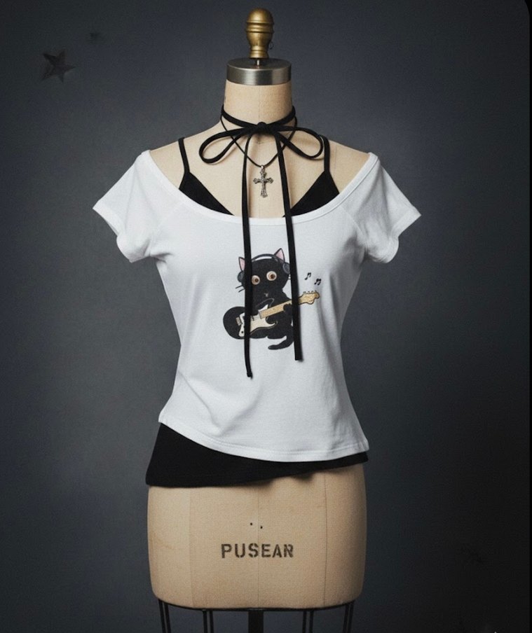 Baskılı siyah kedi figürü ve tokalı choker detaylı beyaz gotik tişört. Koyu tonlar bulunur.