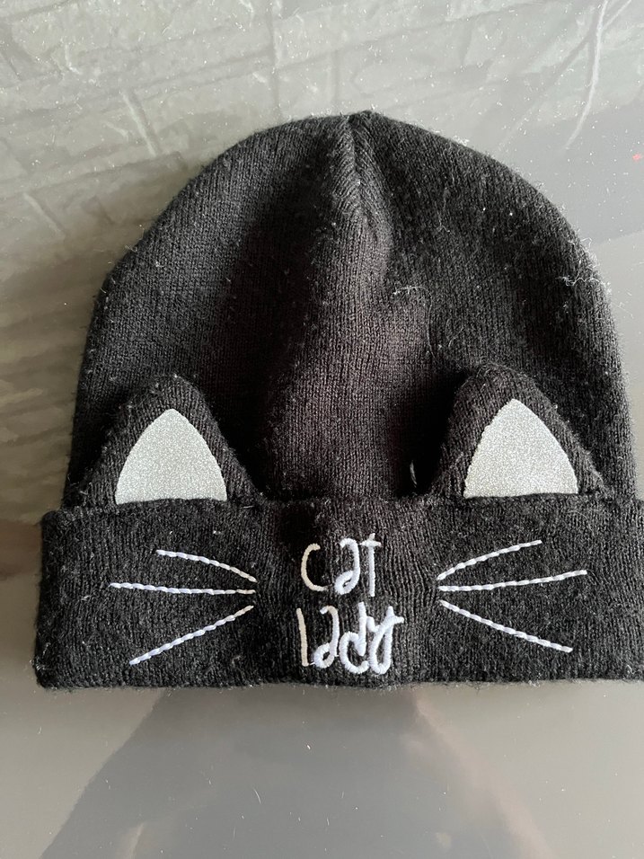 Yumuşak polar kumaştan, koyu gri örgü kadın bere. Kedi kulakları ve nakış detaylarıyla rahat ve gotik tarzı yansıtıyor.