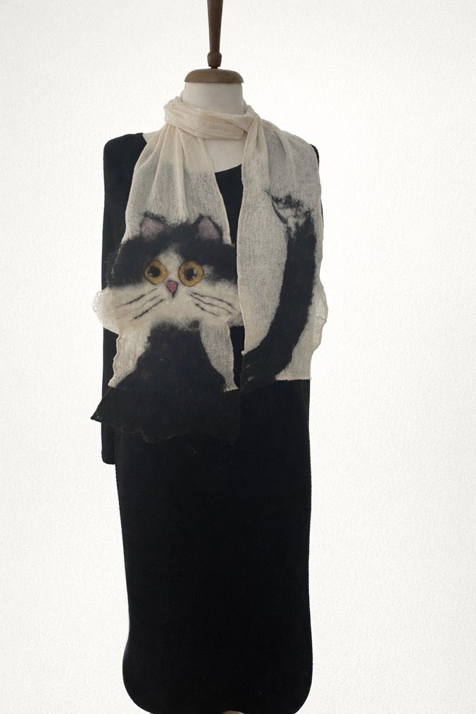 Dokuma kumaş üzerine Keçe ile kedi figür 17 cmx175 cm ıslak Keçe yöntemi ile yapılmıştır
