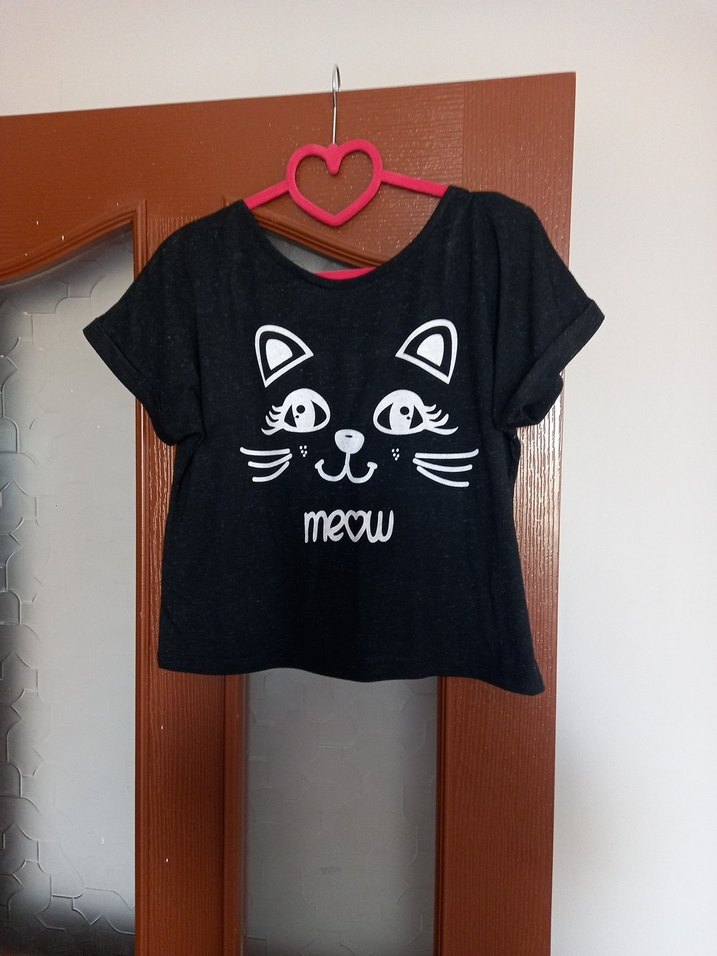 Siyah renkte, kedi yüzü baskılı ve "meow" yazılı goth tarzı tişört, tokalı detaylıdır.
