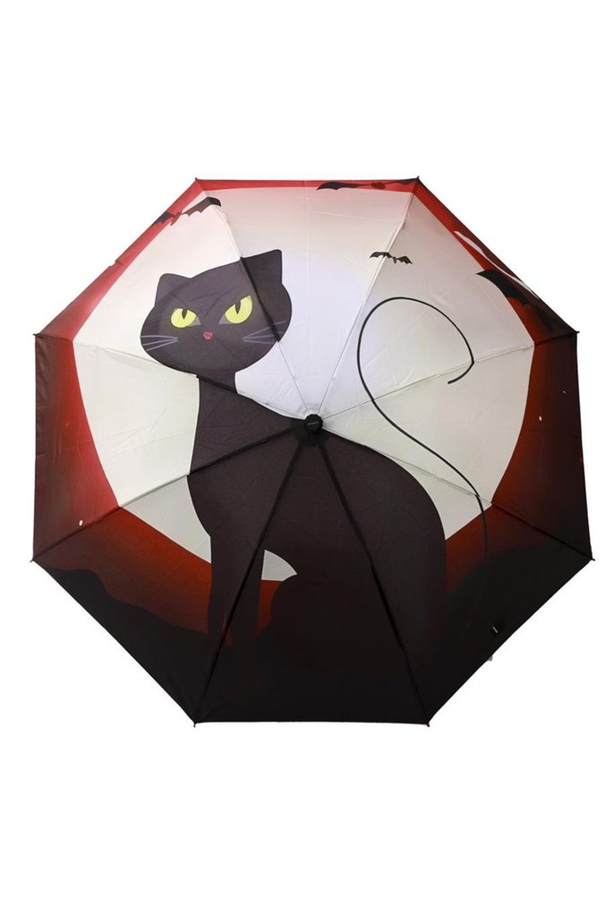 Gotik tarzda, siyah zemin üzerine sarı gözlü siyah kedi desenli kadın şemsiye.