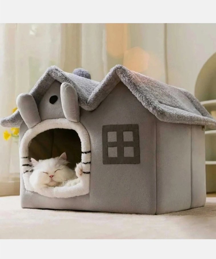 Yumuşak gri kumaştan, kulak detaylı ve yastıklı girişli kedi evi. Hiç kullanılmadı bile diyebilirim kedim tercih etmedi . gayet kaliteli bi duruşu var minderi yıkanabilir makinede .