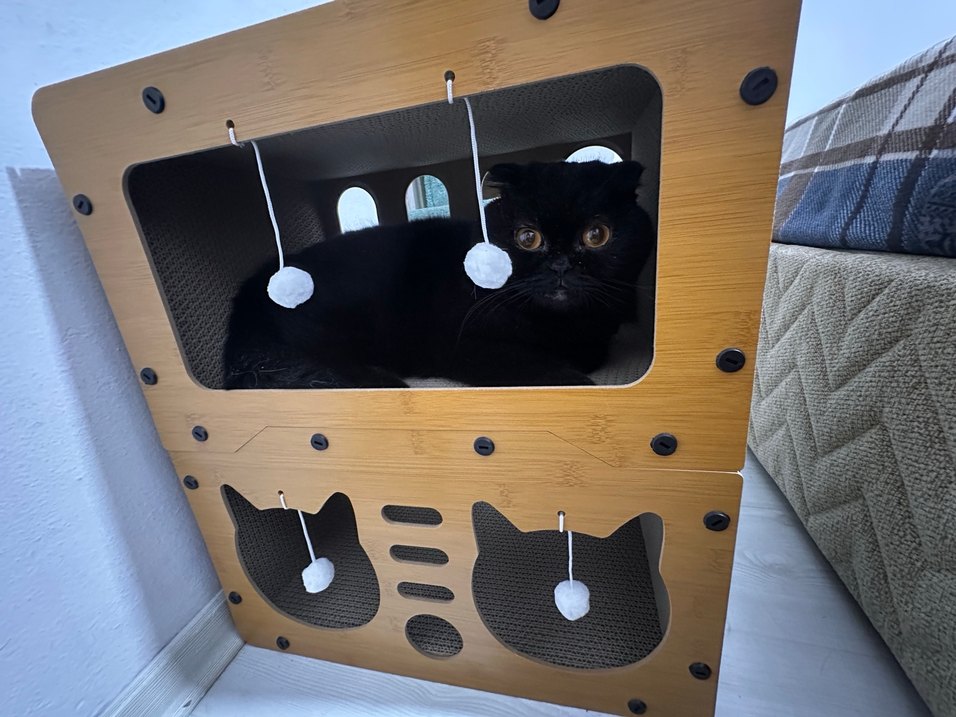 Kedilerin dinlenip oynayabileceği, üzerinde beyaz ponpon oyuncakların asılı olduğu kedi evi.