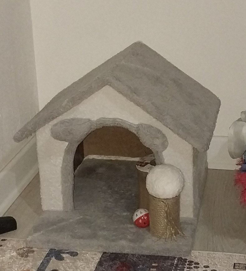Yumuşak çatılı ve tabanlı gri kedi evi, küçük tırmalama direği. Miyavita tırmalama oyuncağı. Her ikiside yaklaşık bir ay kullanıldı.