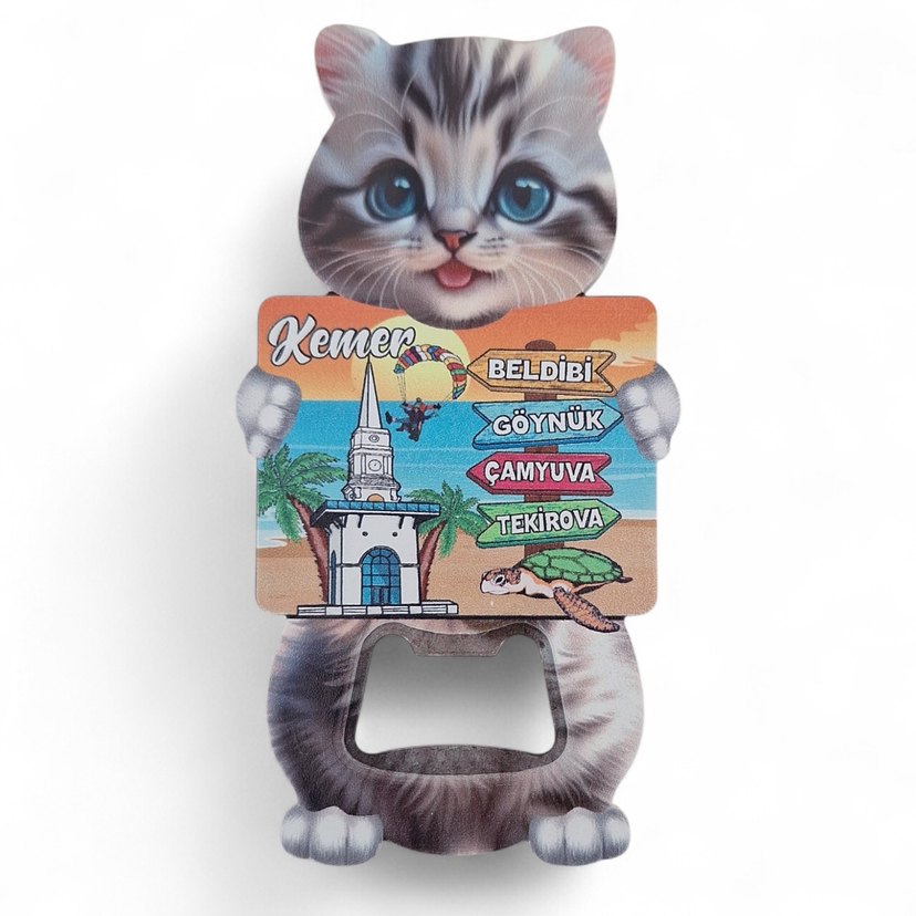 Kedi figürlü gri metal açacak, üzerinde Camyuva, Tekirova, Göynük ve Beldibi yazılı renkli yol tabelası bulunur.
