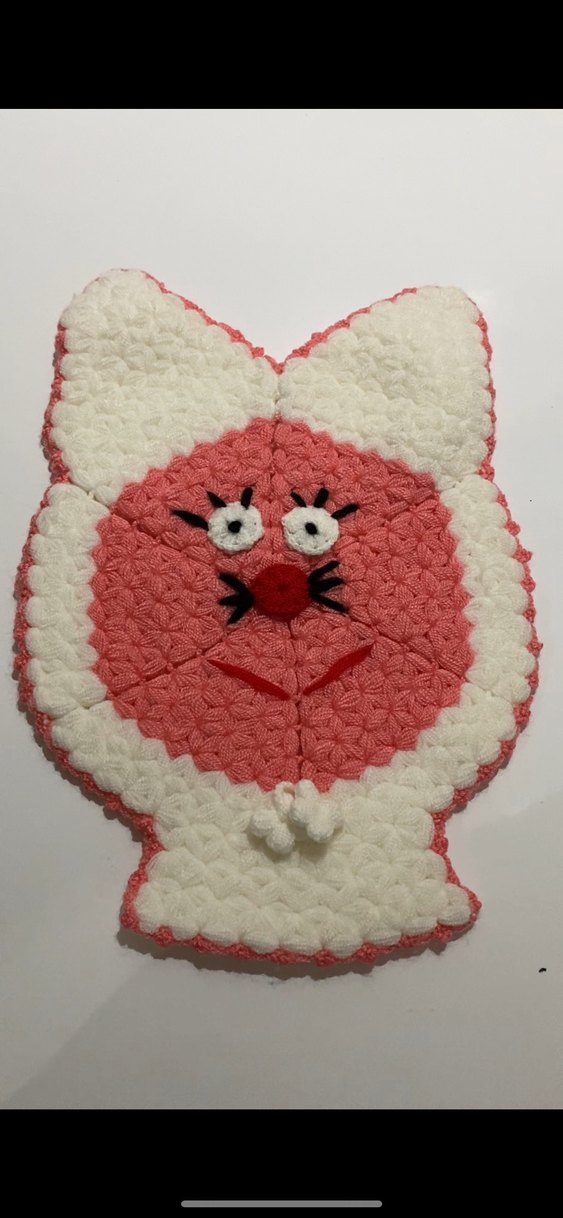 Pembe ve beyaz renklerde, kedi figürlü örgü dokulu renkli banyo süngeri. Yüz detayları nakışla işlenmiştir.