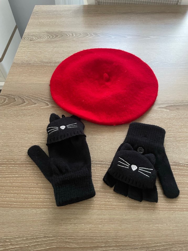 6-8 yaş kız çocuğu için Kedi figürlü siyah eldivenler ve yumuşak dokulu kırmızı bere seti. Eldivenlerin kapağı açılıp kapanabilir.