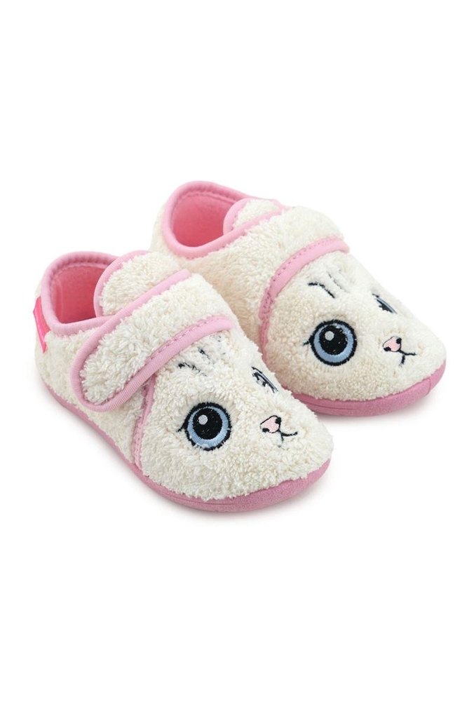 Yumuşak tüylü malzemeden, nakışlı hayvan yüzü detaylı, cırt cırtlı beyaz-pembe kız çocuk terliği. Sokak modasına uygun sıcak tasarım.