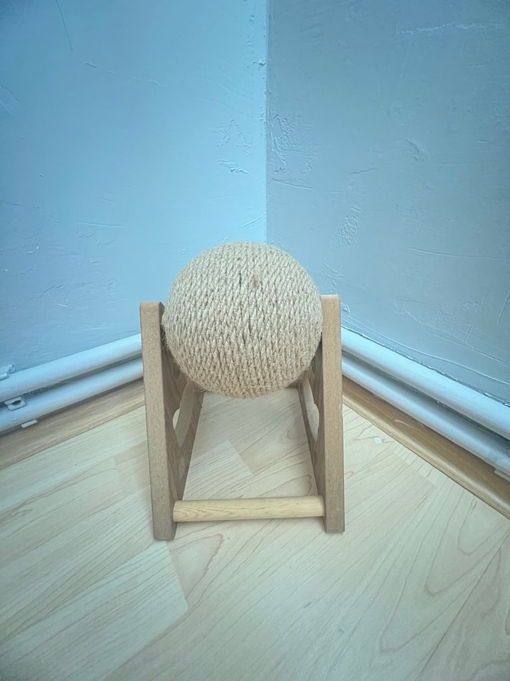 Kediler için ahşap çerçeve üzerinde doğal lifli bej renk top. Dayanıklı ve sade tasarıma sahip oyuncak.