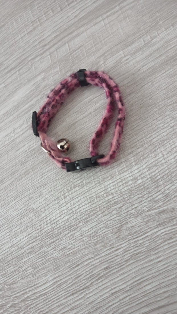 Küçük çan ve ayarlanabilir tokası bulunan koyu pembe desenli kedi tasması.