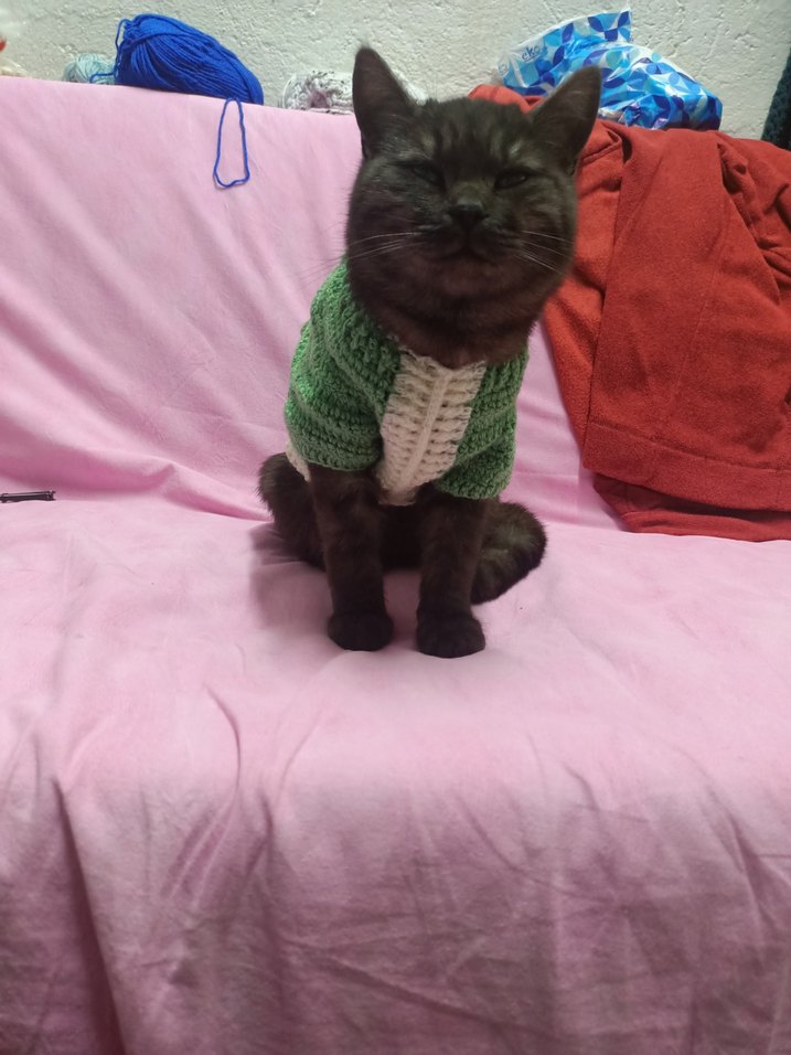 Kediler için sıcak tutan yeşil krem örgü kazak.