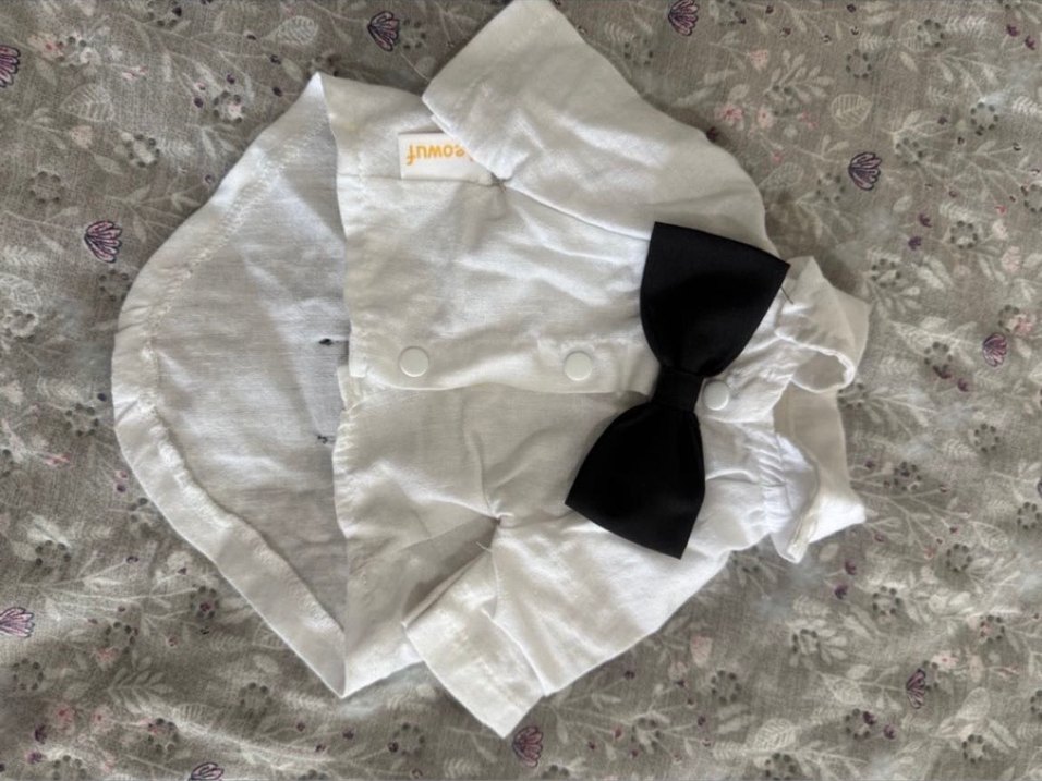 Düğmeli, kısa kollu beyaz mini tuxedo ceket, siyah papyonlu, damatlık için uygun klasik tarzda.