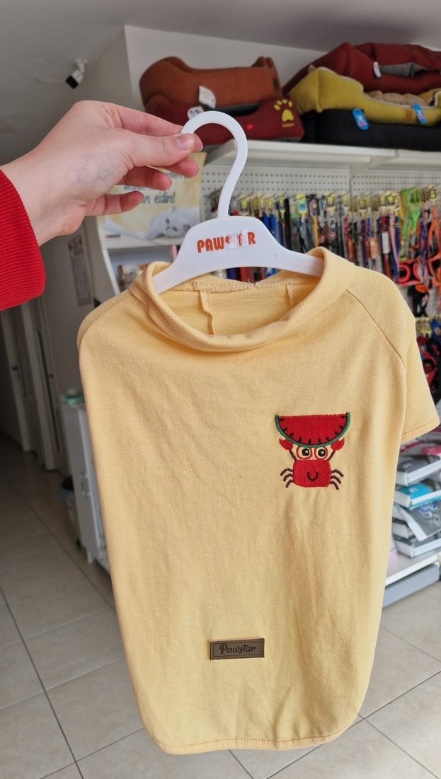 Xl beden mevcut. 8kg'a kadar uygundur Sarı renkli, baskılı ve sokak stili kedi kıyafeti, rengarenk detaylarla dikkat çekiyor.