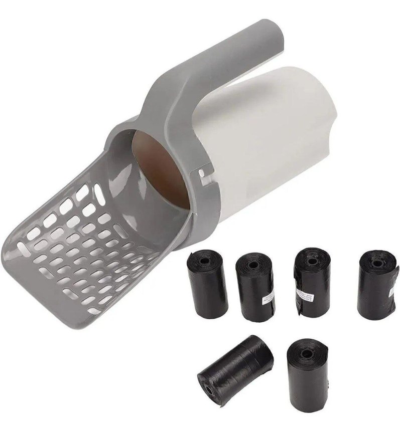 Gri renkte kedi kumu küreği ve siyah poşet seti, temizlik ve atık toplama için kullanılır.
