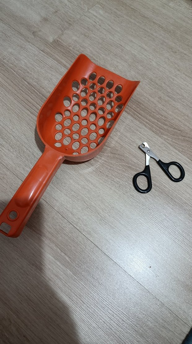 Delikli kahverengi kedi kumu küreği ve tırnak makası seti, kedinizin bakımını kolaylaştırır.