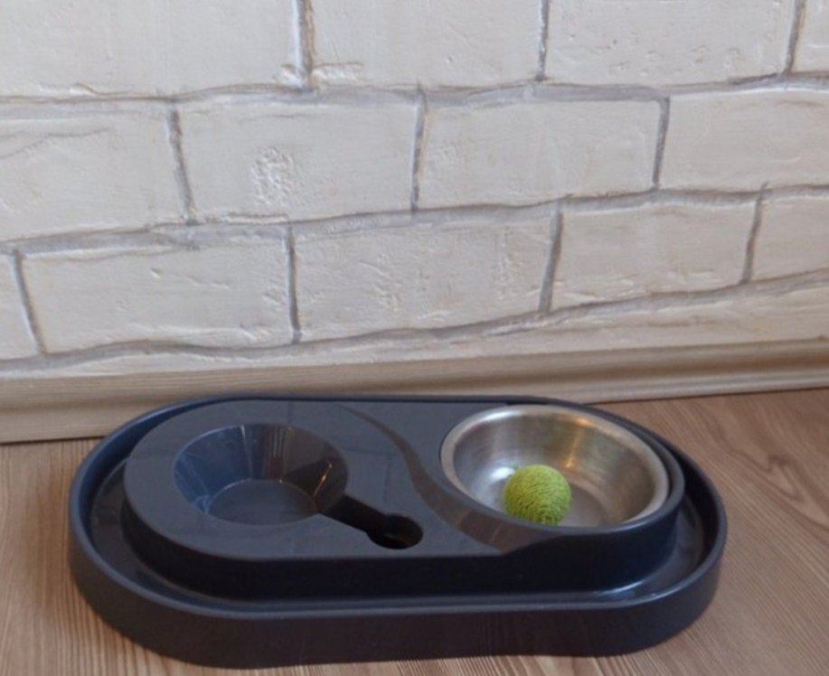 Paslanmaz çelik mama ve su kapları ile birlikte oyun topu içeren kedi kabı seti.