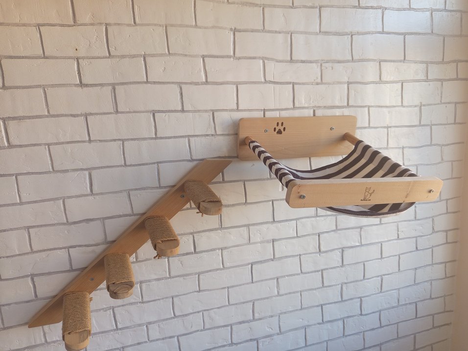 Bej ve gri renklerde, hamak ve tırmalama direkleri bulunan kedi duvar tırmanma ve dinlenme ünitesi. Ahşap ve kumaş malzemedir. Dört parçadır, isteyene ik parça şeklinde ayrılıp fiyatı yarısı olacak şekilde satılacaktır.