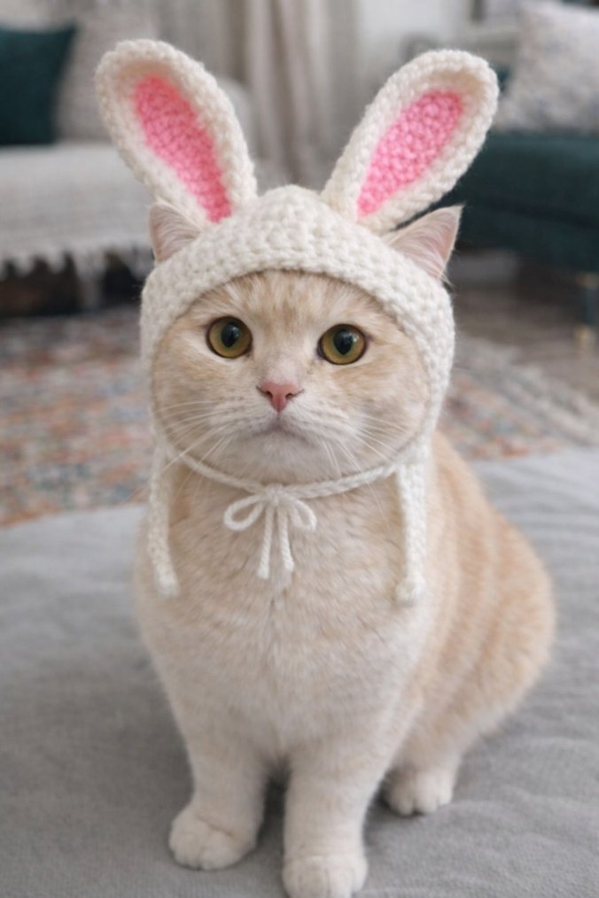 Örgü beyaz, pembe detaylı tavşan kulaklı kedi şapkası. Desensiz, modaya uygun ve özgün bir tasarıma sahiptir.
