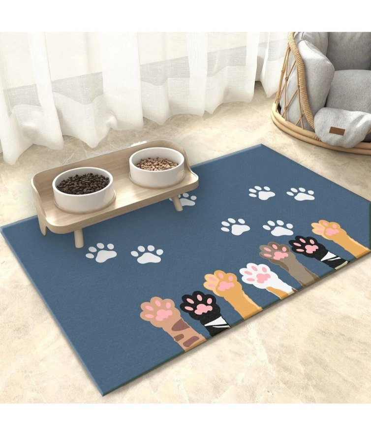 Koyu mavi renkte, renkli kedi pati ve izleri desenli mama altlığıdır. Mama kapları için temiz ve dekoratif bir yüzey sunar.