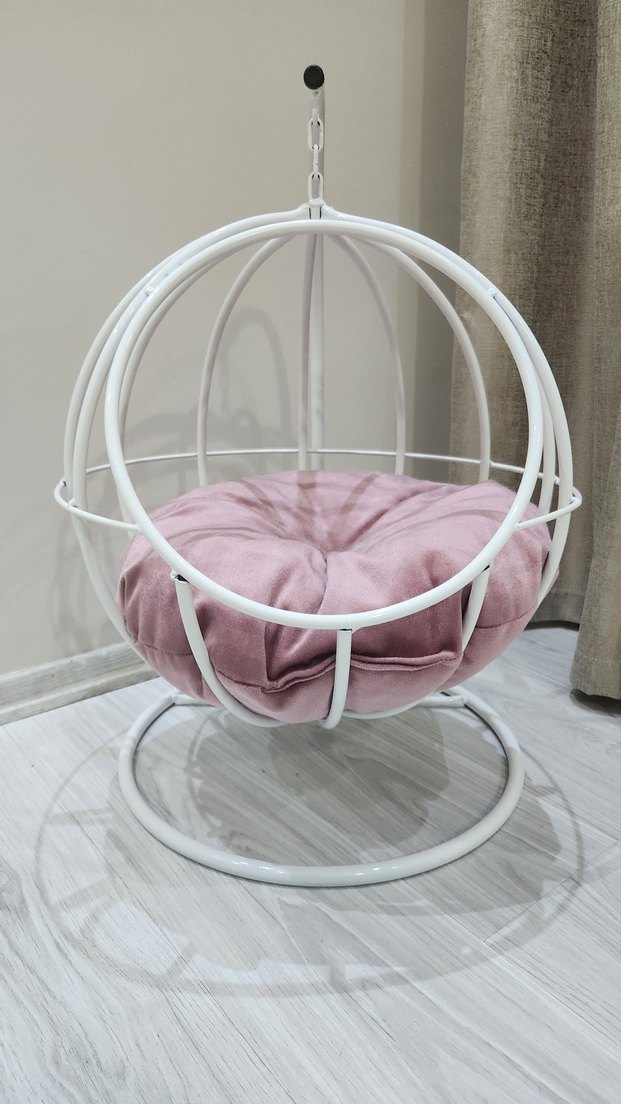 Pastel pembe renkte, yumuşak minderli, metal çerçeveli, sallanabilir kedi sepeti. Rahatlık ve modern tasarım sunar. ️