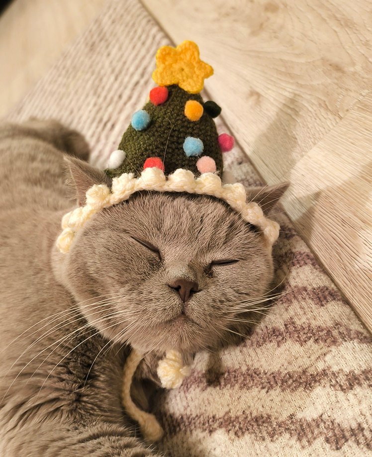 El yapımı tığ işi kedi şapkası. Üzerinde renkli ponponlar ve sarı yıldız bulunmaktadır.