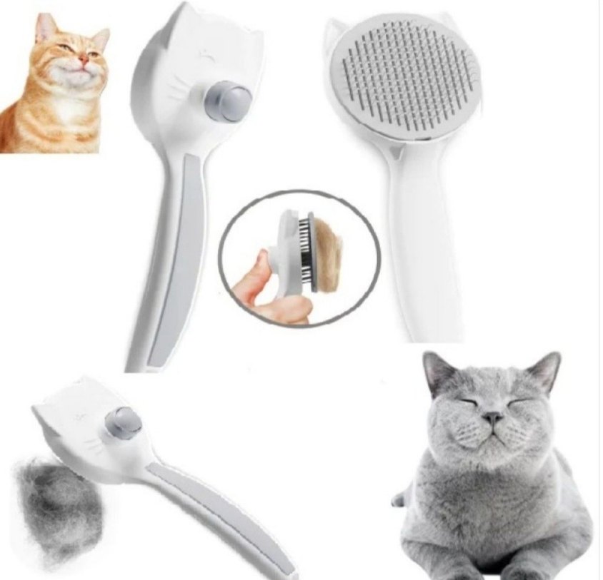 Yeşil saplı beyaz kedi şekilli fırça, evcil hayvan tüylerini kolayca toplar. Temizliği kolaylaştıran çıkarılabilir fırça başlığı bulunur.