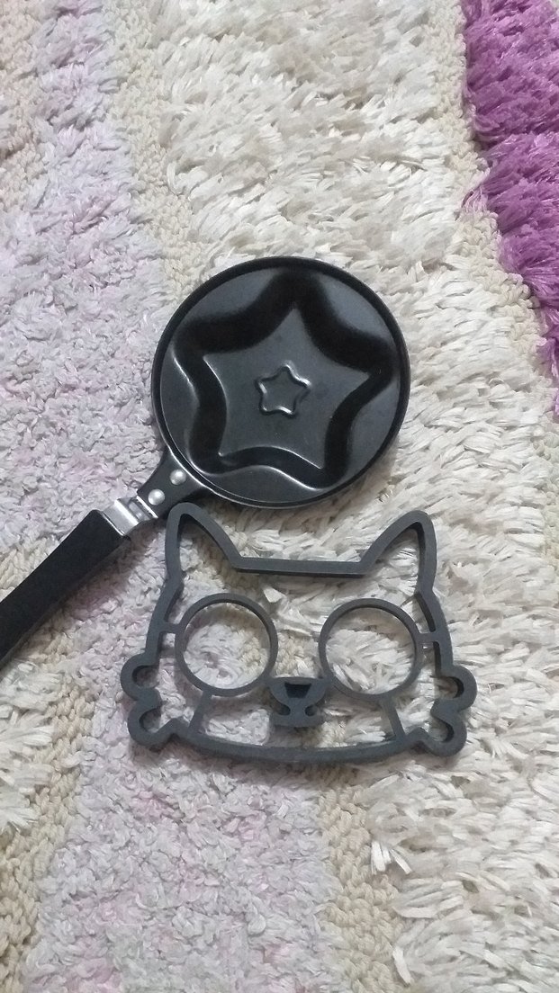 Yıldız desenli siyah tava ve gri kedi şekilli yumurta kalıbı ile yemeklere eğlenceli şekiller verin.