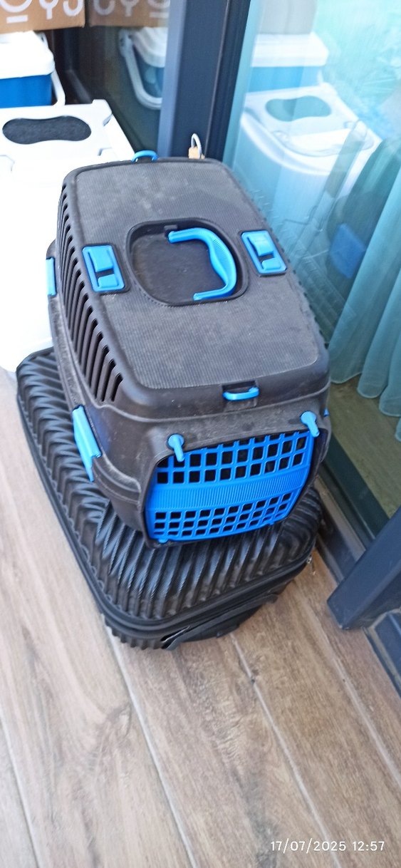 Küçük evcil hayvanlar için havalandırmalı yanları ve üstte taşıma sapı bulunan koyu mavi taşıma ve tuvalet kutusu.