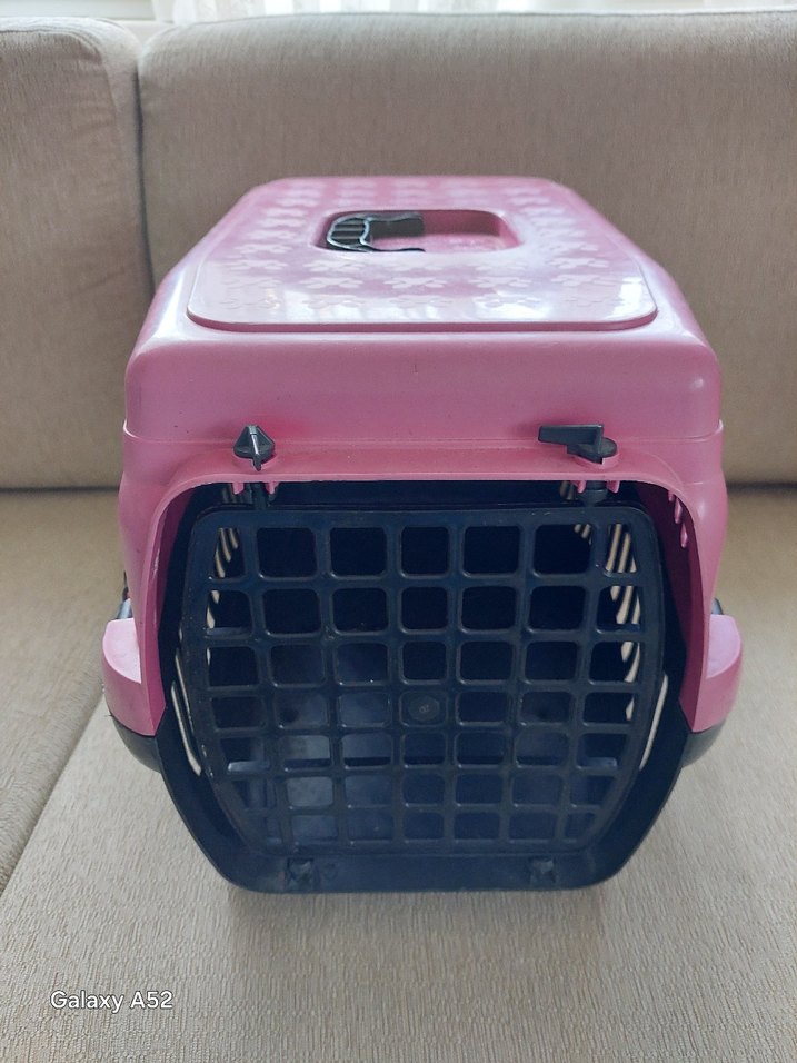 Pembe renkli taşıma kutusu, siyah ızgara kapak ve üstte taşıma sapı ile küçük evcil hayvanlar için uygundur. Yeni hiç bir defosu yok.