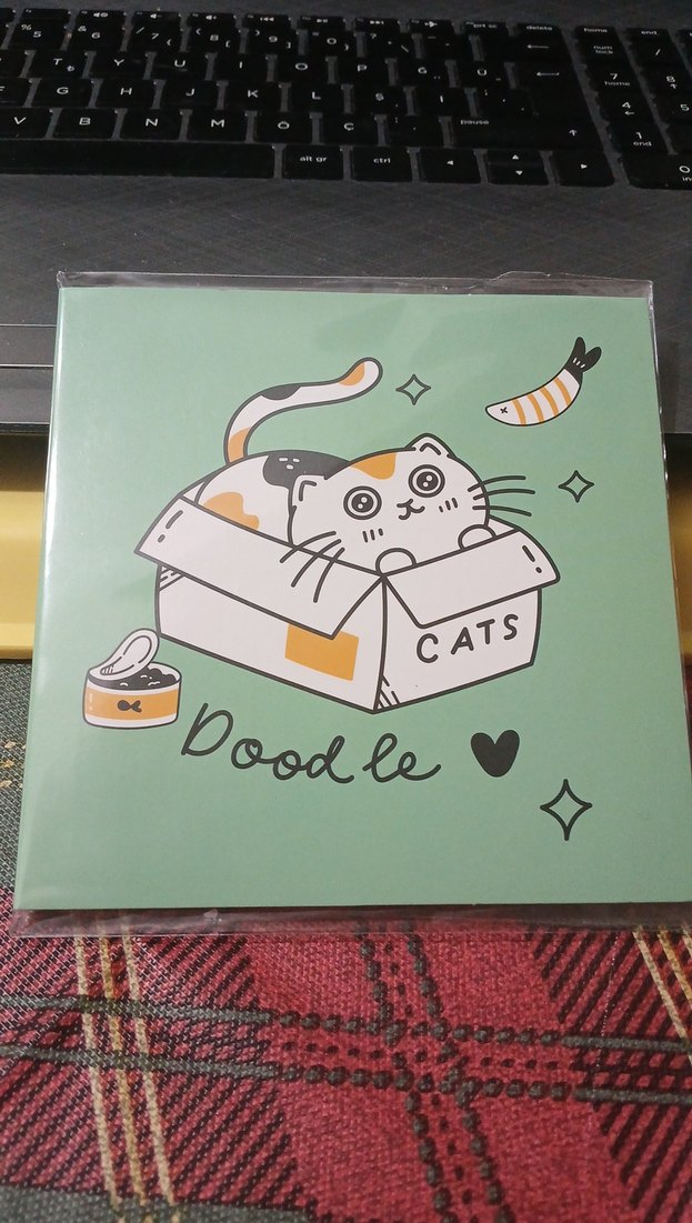 Yeşil kapakta kutuda oynayan kedi ve balık çizimleri bulunan kedi temalı doodle tasarımlı defter.