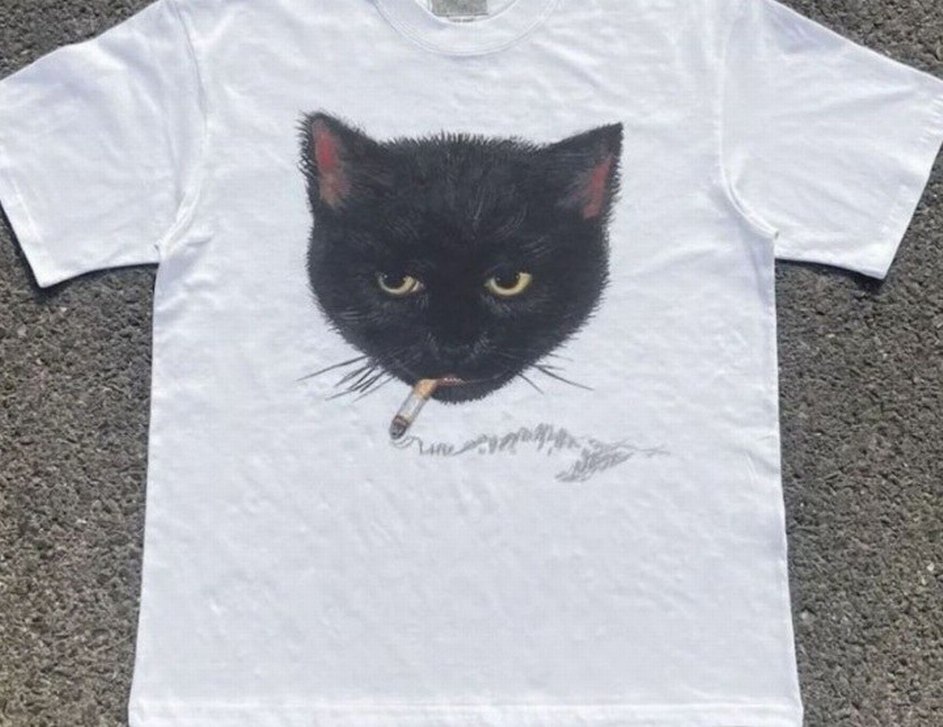 Karanlık, gotik tarzda sigara tutan siyah kedi başı baskılı siyah tişört .