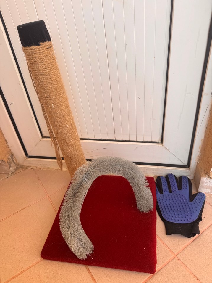 Kahverengi kedi tırmalama direği, kırmızı taban ve gri kıvrık oyuncak ile tüy toplama için mavi bakım eldiveni içerir.
