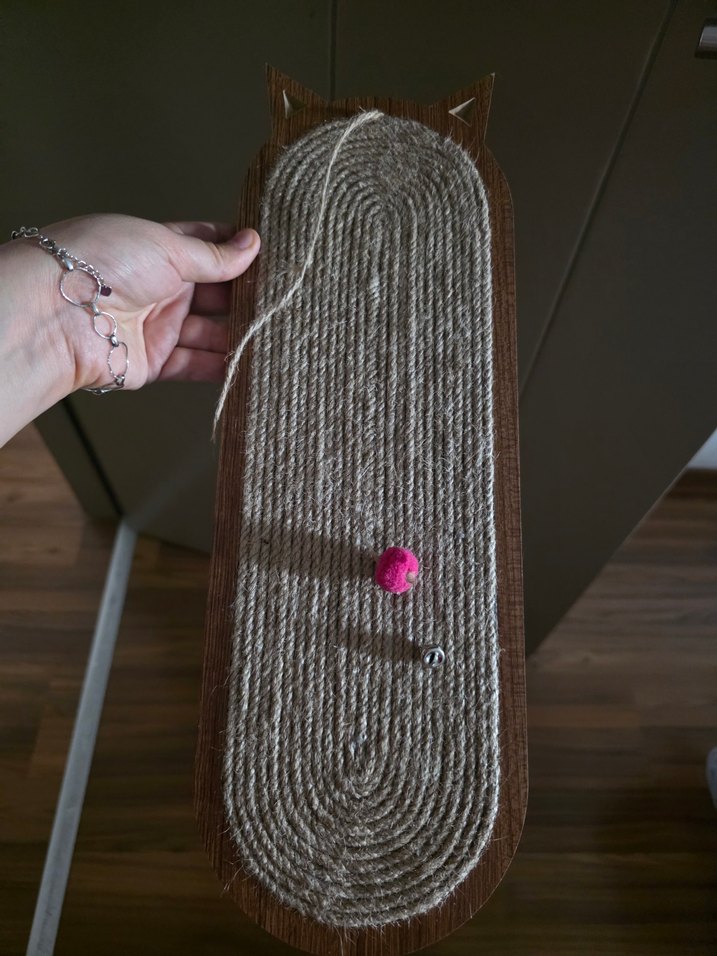 Bej ve gri renklerde, kedi tırnak bakımı için uygun, üzerinde küçük pembe top bulunan tırmalama tahtası .