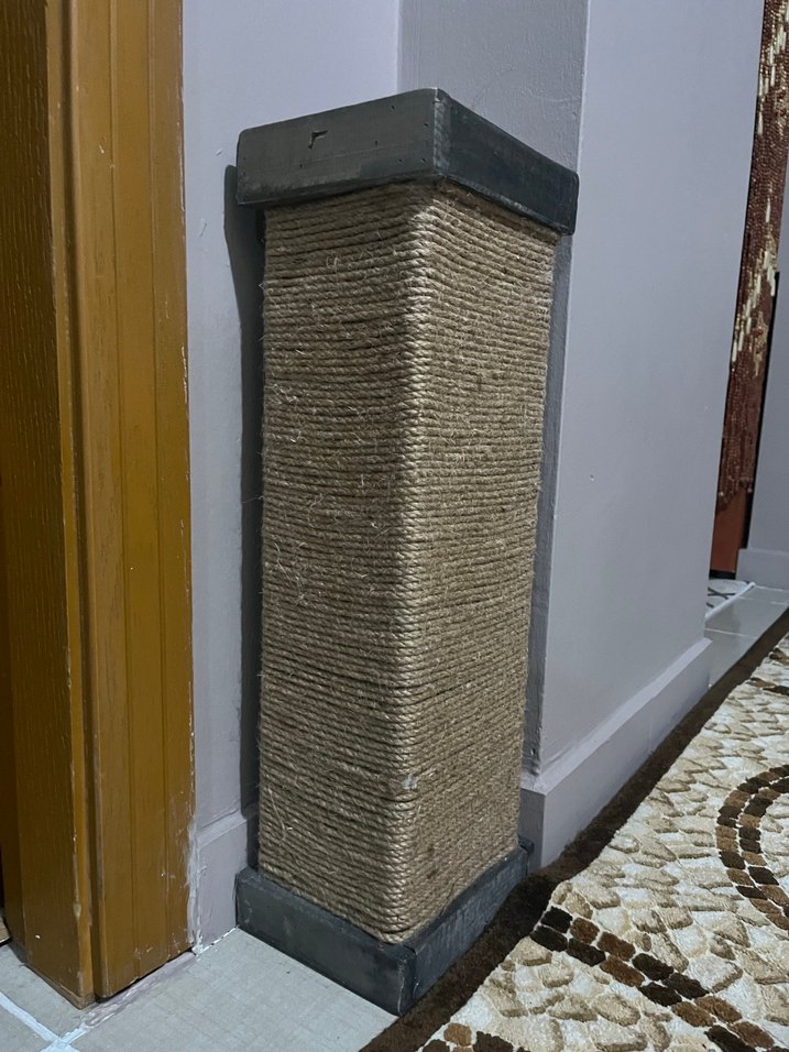 Köşe kullanımına uygun, dayanıklı halatla kaplı gri kedi tırmalama tahtasıdır. El yapımıdır kendimiz yaptık