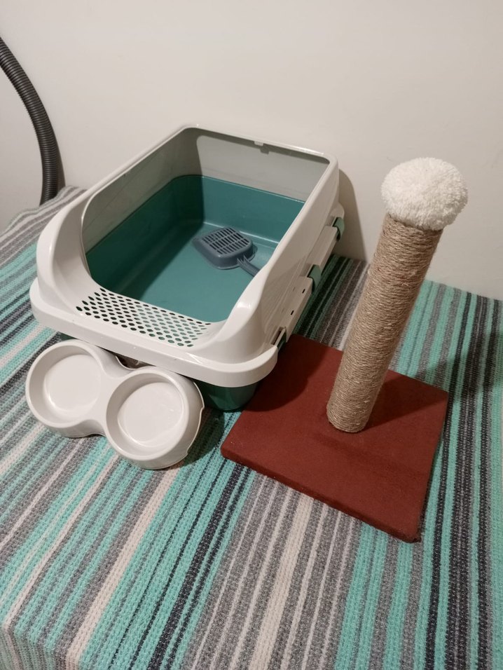 Turkuaz renkli kedi tuvaleti, gri üst kısmı, kürek ve çift mama kabı ile birlikte tırmalama direği ve tarağı hepsi verilecek