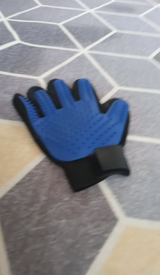 Mavi kedi tüy temizleme eldiveni, yumuşak kauçuk uçlarla tüyleri nazikçe toplar. Ayarlanabilir bilek kayışı ile sabitlenir.
